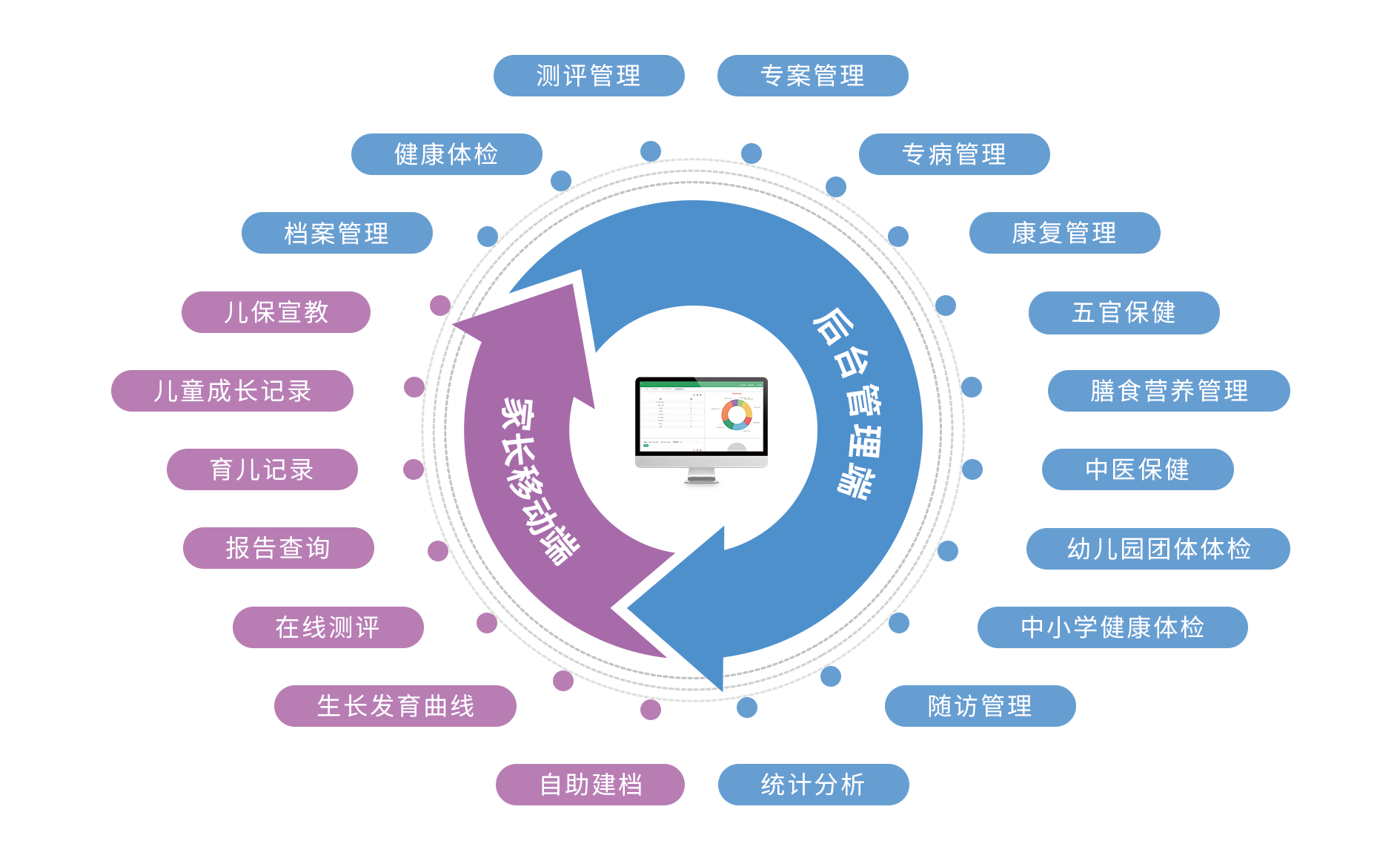 主要針對兒童的生長發育、膳食營養、疾病預防、健康管理和生命監測等方面,對兒童身心健康進行綜合性的篩查與管理,形成健康管理一體化的服務模式,通過大數據統計分析實現篩查、測評、指導、保健、發展、管理為一體的兒童保健管理平臺。